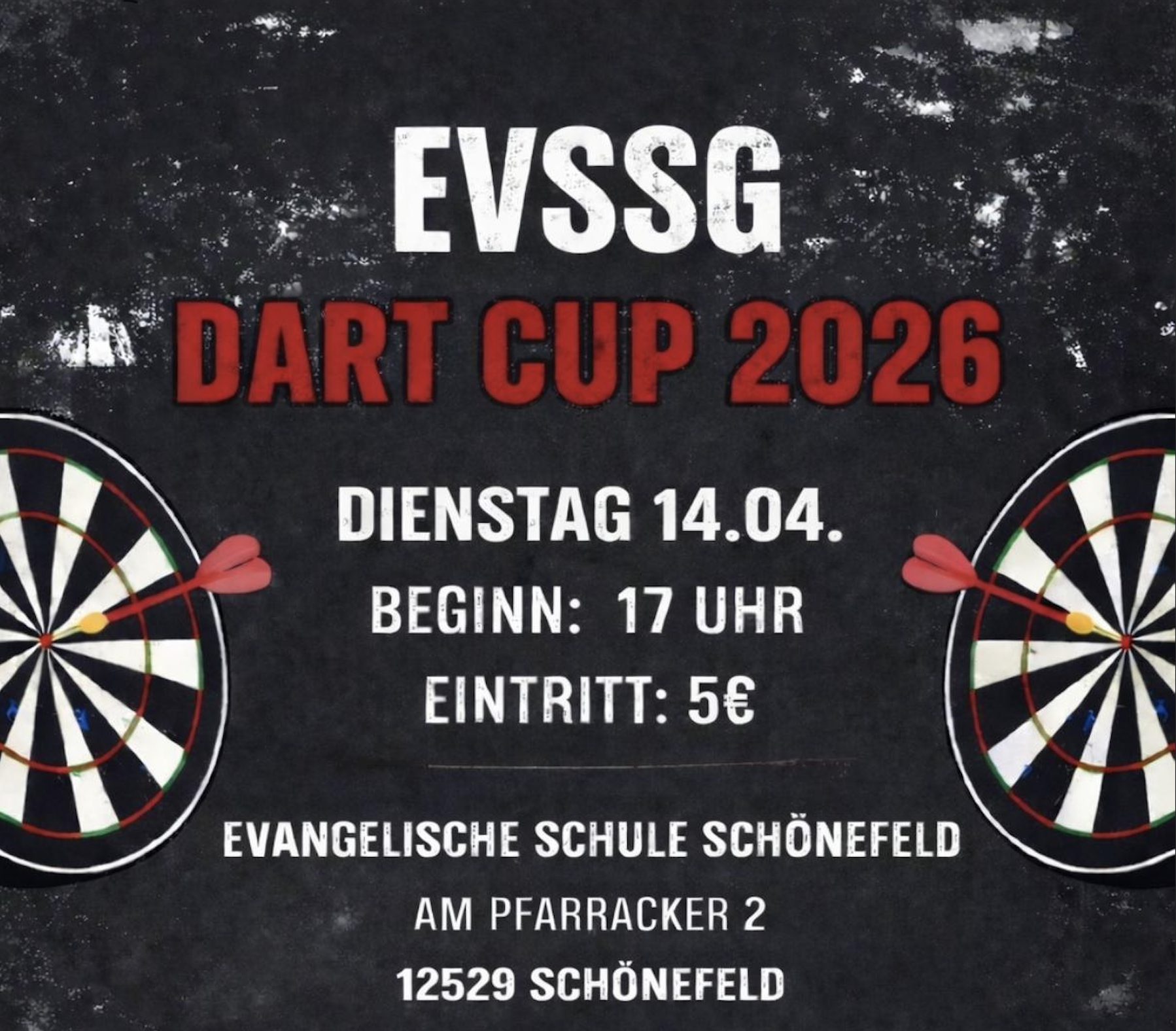 Vielen Dank für dein Interesse am EVSSG Dart Cup 2026! Mit deinem Ticket bist du Teil eines spannenden Dart-Events an der Evangelischen Schule Schönefeld.
